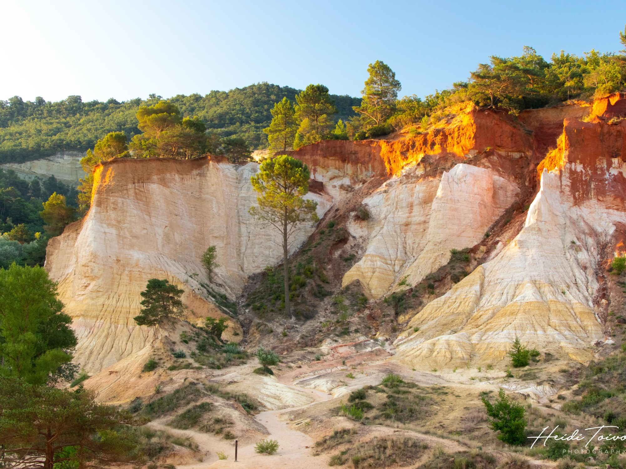 The legend of Roussillon explains the colors of the cliffs. It’s a tale of illicit love with a tragic end. Lady Sermonde, wife of the Lord Raymond of Avignon, fell in love with a troubadour working at their castle. Guillaume, the troubadour, started writing songs about their love and eventually the couple got cought. Lord Raymond took his revenge, stabbed Guillaume and served his heart to Lady Sermonde. After learning what had happened, she ran out of the castle and threw herself off the cliff. It was her blood that stained the cliffs with the colors of red we still see today.